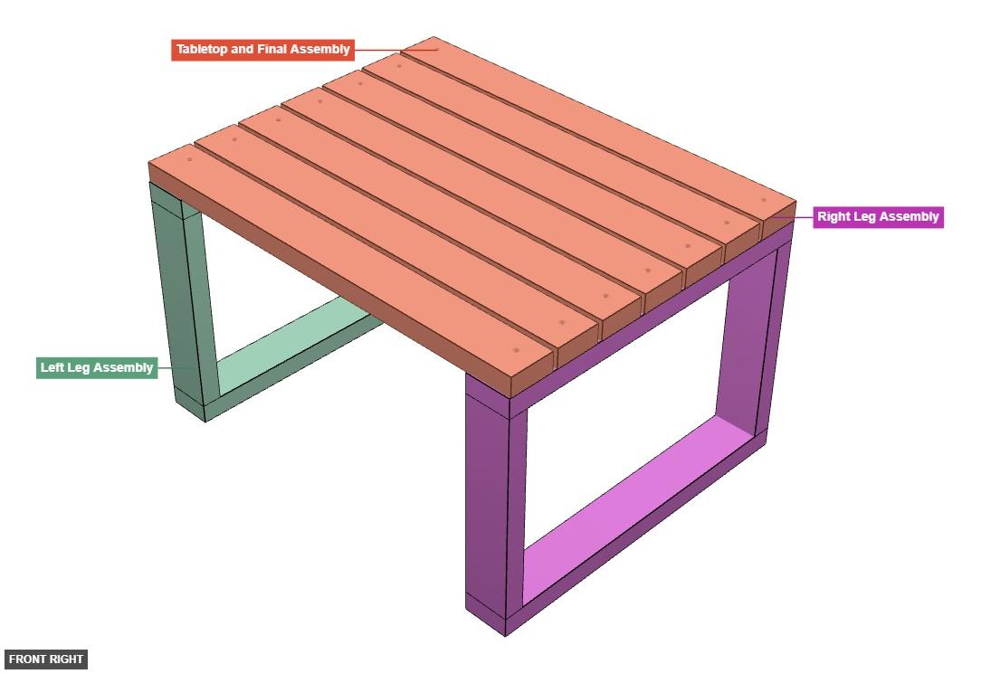 Before assembly begins, familiarise yourself with the three main components: the Right Leg Assembly, the Left Leg Assembly, and the Tabletop planks. Each leg is built as a self-contained rectangular frame, then both frames are stood upright and the tabletop planks are laid across them.